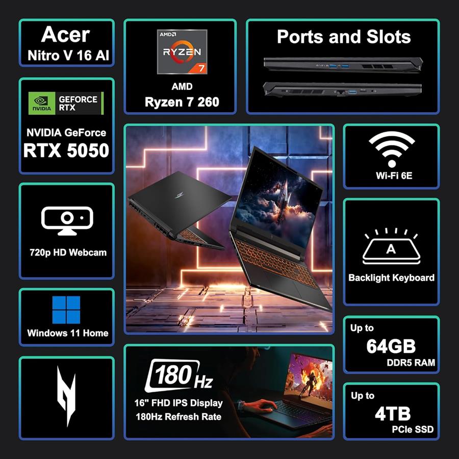 Notebook ACER NITRO 5 RYZEN AI 7 260, RTX 5050, 16Gb RAM DDR5, SSD NVMe 512Gb, 16" 180Hz